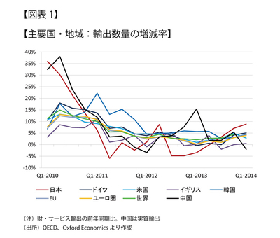 現に、国毎の為替変動や物価格差などの影響を除いた輸出数量(国際収支ベースの財・サービス輸出)を見ると、日本の伸びは世界合計および他の主要国を上回っている(図表1)。この輸出数量には輸送・通信などのサービス輸出も含まれているが、財輸出だけに絞っても傾向はほぼ同じである。