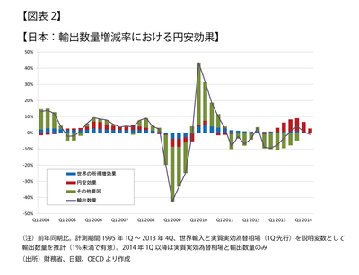 そして、日本の輸出が相対的に堅調な背景には大幅円安がある。図表2は日本の輸出数量増減の要因を円安による効果(円安効果)と世界需要の増加による効果(世界の所得増効果)に分けて推計したグラフであるが、13年以降円安効果が大きく生じている。