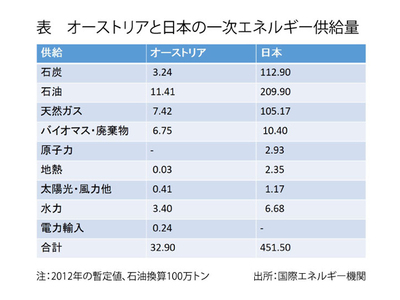 オーストリアと日本の最大の違いは、エネルギー消費量だ。日本とオーストリアのエネルギー供給量とその内訳を表に示した。オーストリアの消費量は日本の7%。そのうち、バイオマスの比率は20%。条件に恵まれているオーストリアでもこの程度だ。「21世紀先進国はオーストリア、ユーロ危機と無縁だった国の秘密」と『里山資本主義』が持ちあげるオーストリアの林業の付加価値額は11億7000万ユーロ、オーストリアのGDP、3107億ユーロに占める比率は0.4%、雇用者数は、林業で7300名、関連産業で14900名だ。オーストリアの雇用者数373万の1%にも満たない。木質バイオマスで地域の産業を活性化し、雇用を作り出すというのは夢物語に近い。