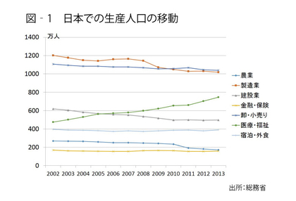 当たり前だが、生産人口の減少とデフレには関係がない。日本で需要が落ち込みデフレになったのは、多くの働く人が一人当たり付加価値額の相対的に高い製造業から、相対的に付加価値額が低い医療・福祉の分野に移動したからだ。要は平均給与の減少に輪をかけて、給与の高い人が減り、給与の低い人が増えたので消費も不振になった。図-1は日本の産業別労働人口の変化を、図‐2は業種別の給与を示している。製造業、建設業から医療・福祉に約300万人の移動があるが、この300万人の人達の給与は大きく下落している。消費も落ち込むわけだ。デフレの正体は産業構造の変化に伴う、付加価値額、即ちGDPの減少、給与の減少、消費の落ち込みだ。