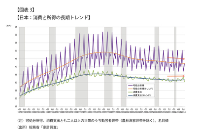 それは、日本の可処分所得と消費支出の長期トレンドを見ても分かる。従来同じ方向の動きとなってきた可処分所得と消費支出は、リーマンショック以降逆方向に動いているのである(図表3)。これは、消費は底堅いのに可処分所得は減少する展開が続いていることを意味しており、これでは早晩消費は息切れしてしまう。