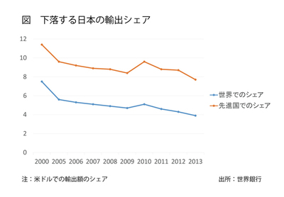 図は、世界の輸出額に占める日本の財の輸出額のシェアを示している。小泉政権時代日本は輸出が好調で経済が持ち直したことがあった。その2000年代前半でも日本の輸出のシェアは低下している。日本の輸出の伸び以上に世界の輸出は伸びていたのだ。エネルギー価格上昇の影響を取り除くために、先進国のなかでの日本のシェアも図には示しているが、やはり波を描きながら低下している。