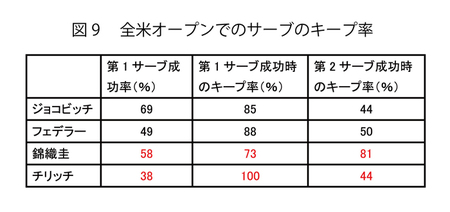 こうしたサーブの改善、相手を研究した上での高い予測・見極め、そして攻めの姿勢が結果として表れているのが第2サーブの成功時のキープ率だ。図9を見て欲しい。IBM社が出した全米オープン上位4人のデータだ。