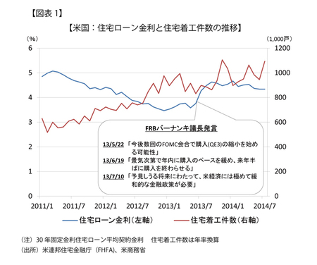 アメリカでは、昨年来住宅投資の伸びがやや停滞している。背景として指摘されるのは、金融機関の住宅ローン貸出姿勢の厳格化、住宅の供給制約などである。また、アメリカの住宅着工件数は、FRBバーナンキ前議長が量的緩和縮小に言及して住宅ローン金利が急上昇した昨年6月以降伸び悩み傾向が強まっており、金利上昇の影響も窺われる(図表1)。