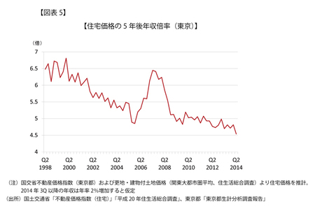 そこで、図表5は、今後年率2%で賃金が増加すると仮定して、住宅価格を5年後の年収で割った倍率を示したものである。グラフで分かるように、脱デフレの下ではそう大きいとは言えない年率2%の名目賃金上昇率でも、年収倍率は随分と改善していく。