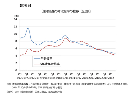 しかも、将来年収が緩やかに増加することでの住宅取得増加効果は、東京圏よりも全国でより強く発現する可能性がある。というのは、全国ベースでは依然として住宅価格が下げ止まっておらず、住宅価格の年収倍率も東京圏より一段と低くなっているからである(図表6)。全国的に年収が緩やかに上昇することとなれば、住宅取得余地や全国ベースでの住宅価格上昇余地は一段と広がることになる。