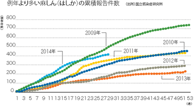 国立感染症研究所の発表によれば7月30日現在、麻疹(はしか)の推定感染地域は国内324に対して国外87。また、今年の麻疹は例年よりも多く罹患者が報告されており、注意が必要だ(下図参照)。