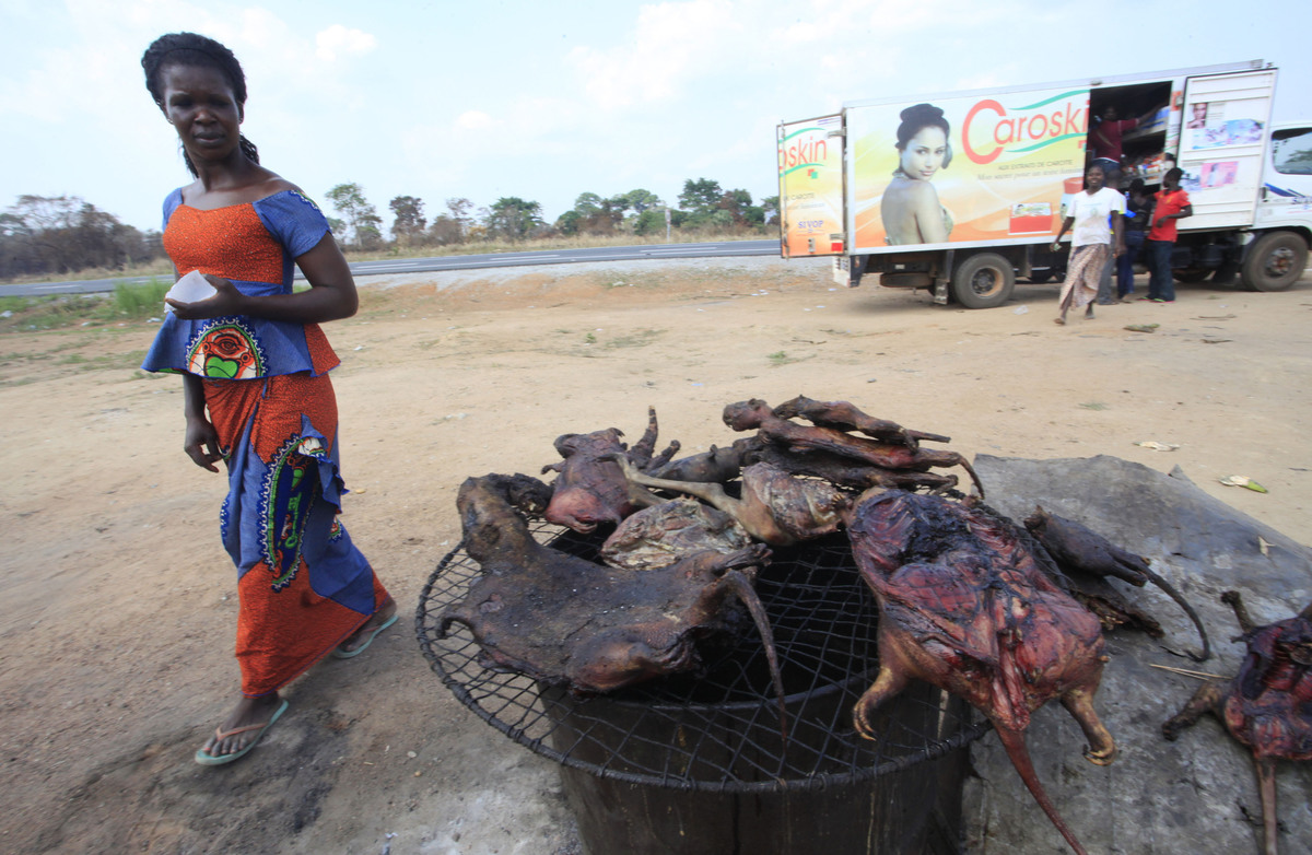 アフリカではコウモリ、アンテロープ、リス、ハリネズミ、サルなど様々な野生動物を食べる習慣がある。エボラ出血熱の起源はアフリカの密林に生息するコウモリにあると言われている。(c)Thierry Gouegnon/REUTERS/AFLO