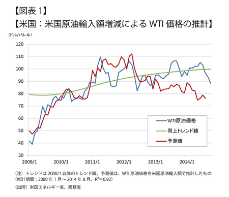 ちなみに、2000年以降のアメリカの原油輸入額とWTI原油価格との相関を元にした推計では、アメリカの原油輸入額減少によって現在の原油価格が75ドル程度にまで低下してもおかしくない(図表1)。