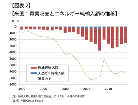 アメリカの原油輸入額の減少は、貿易赤字の縮小を通じてドル相場にも影響を与える。すでに改善が著しいアメリカの原油自給率がいずれ100%に近づくと想定することもあながち荒唐無稽ではないが、仮にそうなると、貿易赤字は大きく縮小して一段とドル高になる事態も十分に想定される(図表2)。