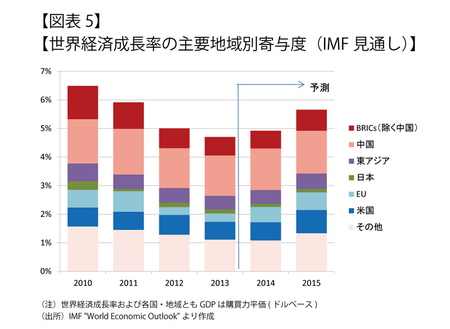 もっとも、消費主導への転換と成長減速は中国経済のバランスの取れた成長には資するとしても、従来中国経済の高成長を享受し、中国への資源・製品輸出や対中金融取引増加などで成長してきた世界経済の減速は避けられない(図表5)。