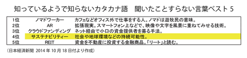 日本経済新聞(10/18付)の「知っているようで知らないカタカナ語」。「聞いたことすらない言葉も」という記事がありました。その中で、「サステナビリティー (持続可能)」が、第4位にランク付けされていました。この単語は、海外では漁業はもちろんのこと、環境関係の言葉として重要なキーワードです。残念なことに、この重要な言葉が日本ではほとんど一般的には知られていないようです。