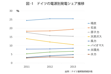 再エネの比率が増え、風力と太陽光からの発電量が全体の13%に達したドイツでも、コスト上昇を抑えるために石炭火力からの発電量が上昇している。図‐1の通りだ。再エネを導入したために、皮肉なことにCO2の排出量が増加し、このままでは20年のターゲット、90年比40%削減は5%から8%未達になるとドイツ経済省は予想している。このために、12月3日に閣議決定予定の新政策ではエネルギー効率向上に加え発電部門での石炭消費量削減策が織り込まれる可能性があるとみられている。