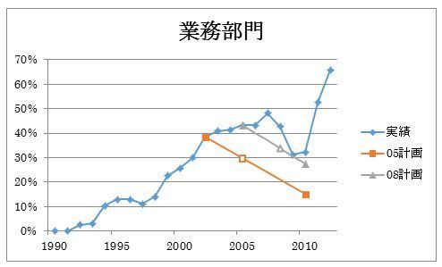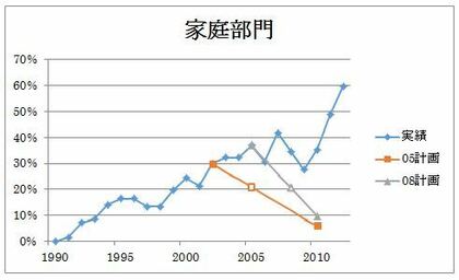 だがこの2010年の目標は計画の実施途中で各々10%、27%に変更され、結局、2012年の実績値は業務・家庭部門でそれぞれ60%、66%と、大 幅に当初計画を上回る排出量増加になった。これには原子力発電停止の影響ももちろんあったが、震災前の2010年時点で各々35%、32%だったので、震 災が無くとも、当初の計画を大きく上回ったことに変わりはない。