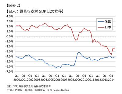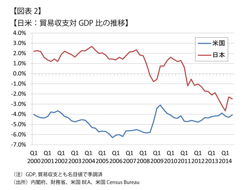 また、円安水準だが、現在の水準はリーマンショック前の水準に戻った程度であり、際立った円安水準とは言えない。また、対GDP比で見れば、最近の日本ではアメリカに近接するような巨額の貿易赤字が継続しており(図表2)、通貨安・通貨高要因となる金利が円の場合日米欧で最も低い水準にあることからも円安に過ぎるとは言い切れない。