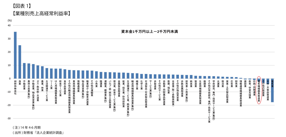 円安にもかかわらず製造業中小企業の収益が悪化しているのは、法人企業統計からも確認できる。この1年あまりの景気回復で主要業種とも業績は改善しているが、小規模中小企業では電気機械器具製造業などが赤字となっており、本来円安で潤うはずの輸出関連産業でも円安による原材料費上昇に価格転嫁が追いついていない様子が見て取れる(図表1)。