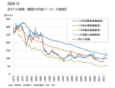 購買力平価とは、自国と外国との物価を同じくする為替相場のことであり、円ドル相場については、73年時点を基準として、日米物価が同じとなる現在の水準をいくつかの種類の物価指数を使って計算できる(図表5)。家計に直接関係する消費者物価で計算すると、円ドル相場の水準は130円ほどとなる。