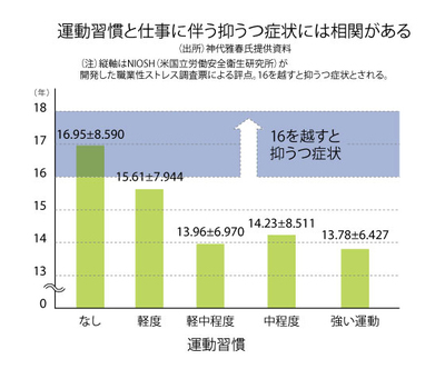 神代:1にも2にも予防です。個人個人が健康を維持し、企業、職場が作業環境を改善する。運動習慣のある人はない人に比べ、日常の勤務によって生じる疲労感が小さく、抑うつ症状も少ないことが分かっています。