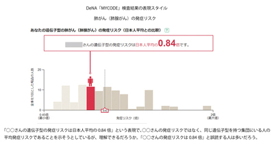 問題なのは、この数値が一見、「利用者が疾患を発症するリスク」のように見えることだ。しかし、実際に出しているのは日本人の平均発症リスクを1とした場合における、その人が属するSNP型集団の発症リスク比。平均点60点のクラスには20点の人もいれば90点の人もいるように、リスク0.84の集団にもリスクが0.55や1.75の人がいる。図に挙げた肺がん(肺腺がん)0.84倍という数値もクラスの平均点であり、そこに属する個人にとってはあくまでも目安でしかない。