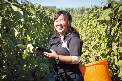 ナスを収穫するチームNの三浦ひかりさん