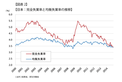 賃金も堅調に上昇することとなろう。景気回復や円安で企業収益が順調に増加すると見込まれる上に、完全失業率は3.4%(14年12月)まで低下していて、雇用ひっ迫で賃金を上昇させないギリギリの失業率と言える均衡失業率も同率となっている(図表2)。今後雇用は一段と改善すると見込まれ、広がりつつある人手不足はさらに広がり、賃金を押し上げることとなろう。