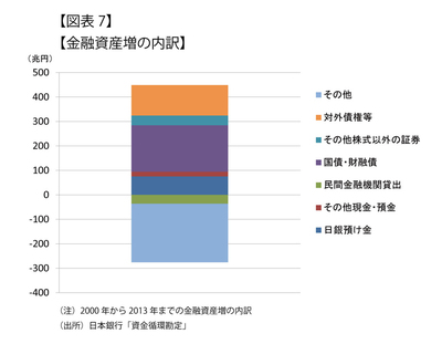 さらに、2000年以降のマネーサプライ増分がどこに向かったかを見ても、多くは国債・財投債や海外に向かっており、企業や家計には向かっていない(図表7)。企業と家計に資金需要が乏しければ、日本経済は安定成長が持続しにくく、企業収益と消費の拡大が支える好循環経済にたどり着きにくくなる。