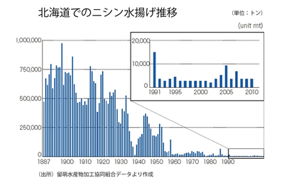 日本では今でも、生き残って産卵に来ている僅かなニシンを獲り続け、極少ないその漁獲量に対して、今年は前年に対して多い少ないと一喜一憂しています。数十年単位のグラフを見て頂ければ、これが、いかに意味がない比較かお分かりになるかと思います。日本の水揚げはかつて100万トン近くありましたが、ここ10年の平均では僅か5000トン弱しかありません。