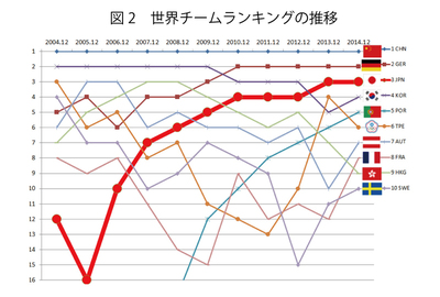 現在、男子のITTF(国際卓球連盟)ランキングは3位、女子は2位。下の図2を見て欲しい。毎年12月時点の男子チームの世界ランキングだが、この10年の間、チームのランキングは16位(2006年6月には18位)まで落ちていた男子は2006年にV字で復活を遂げ、2013年以降、3位を維持している。