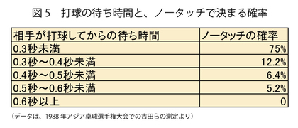 ドライブやスマッシュなどによる強打時のボールの速さは、秒速30メートル近くに及ぶことがある。もちろん速く返せば、ノータッチで決まる率は高まる。図5のように、相手が打ってからの待ち時間、0.3秒未満の速いボールが、ノータッチで決まる確率は75%と極めて高い。相手打球への対応が時間的に難しいからだ。一方で、0.6秒以上かかると、対戦者が全てのボールをラケットにあてていることを意味する。