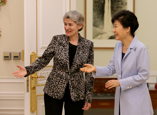 日本の世界遺産登録反対する考えをユネスコに伝えた朴大統領(写真:Yonhap/アフロ)