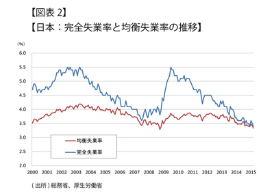 日本の失業率と均衡失業率の推移を見たのが図表2である。均衡失業率とは、労働需給が均衡する失業率水準を指し、賃金がギリギリ上がらない失業率水準と言うことができる。そこで、失業率と均衡失業率との差の大小は、雇用改善や労働需給のひっ迫がどの位まで進んでいるかを示していると見ることができる。