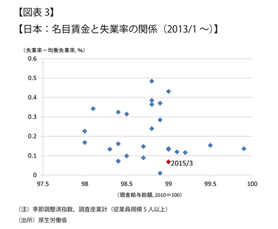この図表2で分かるのは、直近の失業率が均衡失業率とほぼ同水準にあり、リーマンショック前の景気が良かった時点での状況よりも労働需給がひっ迫していると見られることである。かような労働需給では、賃金上昇が加速してしかるべきと言え、これは失業率と賃金がトレードオフになるという経済学的な見方(フィリップス曲線)の示すところでもある。そして、企業業績が大きく改善していることを勘案すると、なおさらである。
