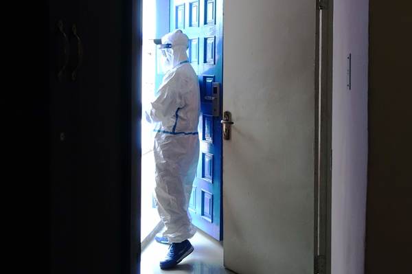 辻館長。背後の作品は 「蟹・牡丹図衝立」一基の内「蟹図」 個人蔵