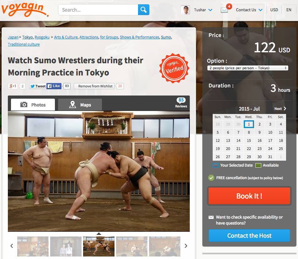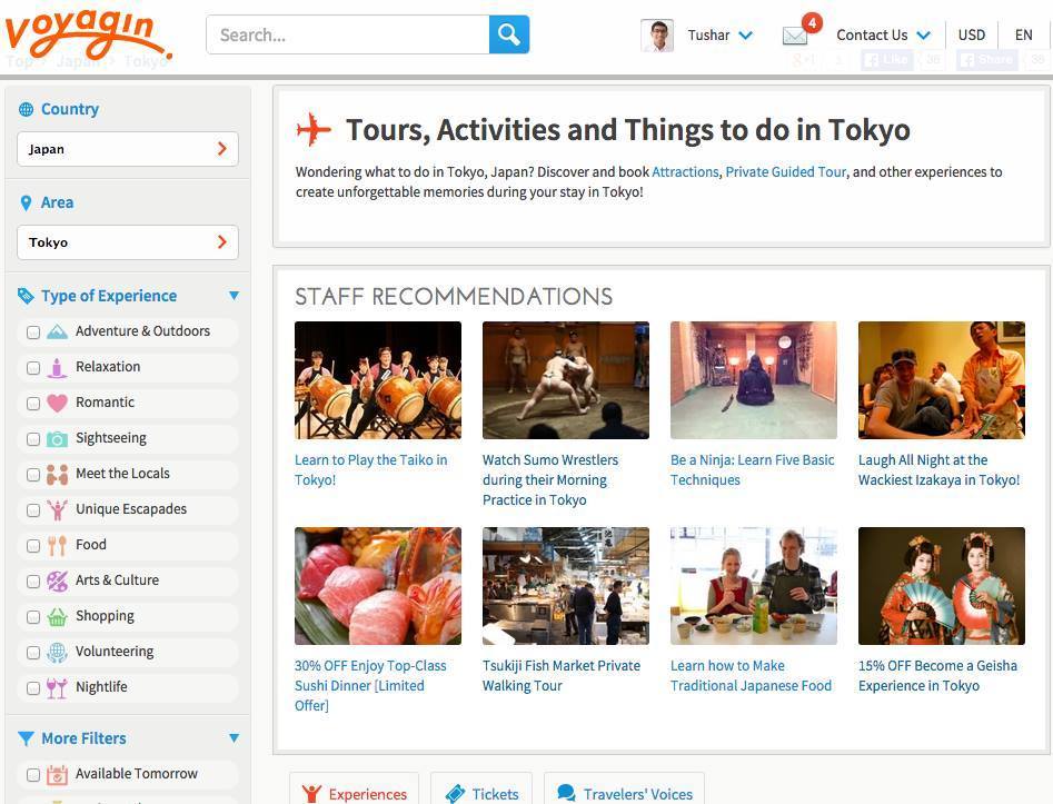 Voyaginは、旅先の旅行体験を個人間で取引することができるwebサイトを運営している。例えば、「築地ガイド、2時間、 50ドル」といった具合で募集がかけられる。Voyaginのホームページは、ツアーガイドや「旅行者に体験を提供したい」 と思う人と、旅行者をマッチングする場だ。