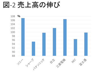 総資産利益率は図-1、売上の伸びは図-2に示されている。シャープ、ソニーは収益性に見劣りがする。加えて、後ほどみるようにソニーの営業利益は金融部門に依存しており、金融の利益がなければ、営業利益の段階でソニーは赤字であることから、ソニーの製造部門の収益力は他社との比較で大きく見劣りする。収益性の偏差値は表-1の通りだ。