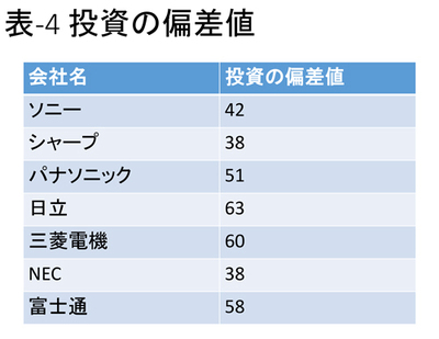 製造業では、製造設備の更新を続けなければ、やがて設備が老朽化し競争力を失う。設備を更新し、業容を拡大するためには設備の減価償却額以上の投資があることが望ましい。償却額と投資額の内訳を記載している企業については、その数字を利用したが、不詳の企業については固定資産の減価償却額と固定資産購入額を比較した。ソニーと日立については、金融関係の投資については除外して計算を行った。