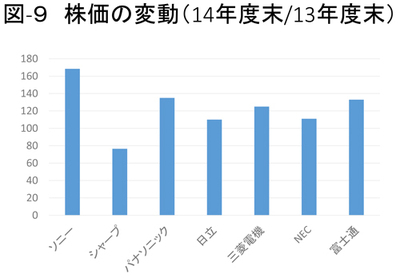企業の利害関係者のうち大切と思われる従業員と株主との関係を取り上げる。従業員にとっては、雇用の維持と給与が大切だろう。当該企業の平均給与と連結ベースの従業員数の推移を図-7及び図-8に示し、指標として取り上げた。偏差値は表-5に示した。さらに、株主にとって大切と思われる株価上昇率を取り上げた。26年度と27年度の3月最終週の終値を比較し、上昇率を計算し図-9に示した。偏差値は表-6の通りだ。