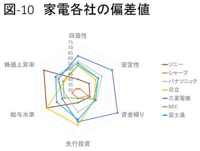家電7社の収益性(ROA)、安定性(自己資本比率)、資金繰り(インタレストカバレッジ)、先行投資、給与水準、株価上昇率に関する偏差値を図-10に示した。平均値は表-7に示されている。シャープは全ての面で劣っている。ソニーは、株価上昇率と給与水準は高いものの、経営に関する指標は見劣りし、偏差値は低い。シャープとソニーの業績はなぜ低迷しているのだろうか。