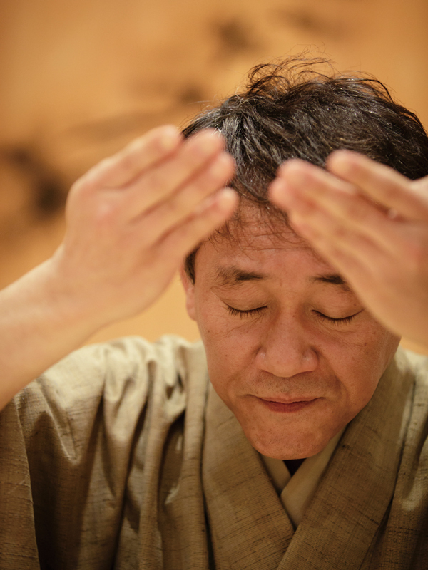 いにしえからの時を刻んでひっそりと息づく場所と、まさに現代の時がビビッドに流れるスポットが折り重なるような京都の町を北に向かう。広大な京都御苑を過ぎ、平成の今を生きる人々の暮らしが広がる住宅地の一角にある日本家屋。そこが大蔵流狂言師・茂山千三郎の自宅兼稽古場だった。玄関を入るとすぐ左手が稽古場。木の香りの漂う静謐(せいひつ)な空間。そこに袴姿の千三郎が立つと、狂言の生まれた室町時代まで一気に時代が遡っていくような不思議な感覚が生じる。