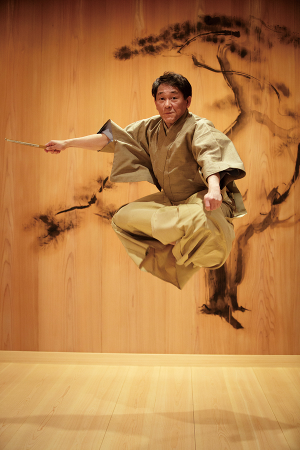 ゴリラの姿勢は猿とは違う。背筋をそらせ威厳を示し、長い腕を垂らし、腰を落とす構えは、普通の狂言の数倍の体力を必要とする。