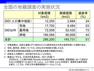 これは、都市部などの土地では「境界、面積、所有者などについて争いの可能性」を有していることを示している。地籍確定率は大都市部ほど低く、東京22%、神奈川13%、千葉14%、愛知13%、大阪10%、京都8%などとなっている。