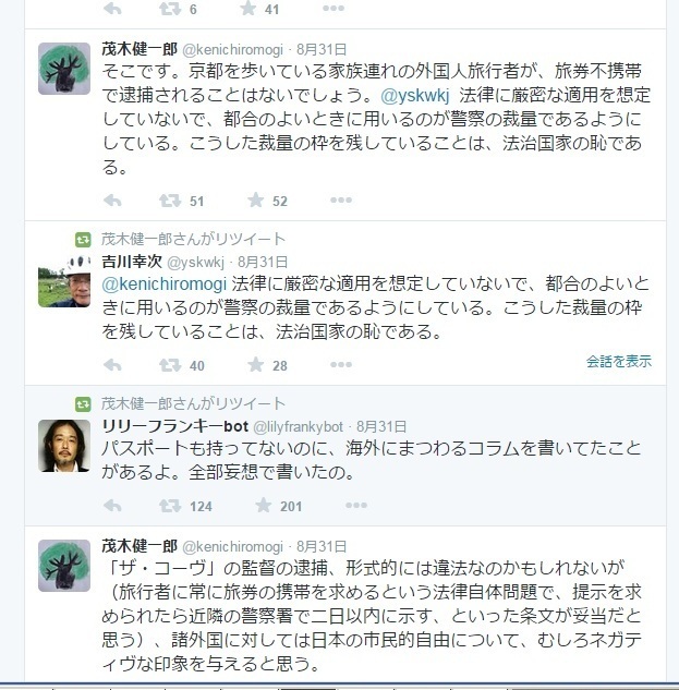 茂木氏はさらに「京都を歩いている家族連れの外国人旅行者が、旅券不携帯で逮捕されることはないでしょう」ともつぶやき、和歌山県警の姿勢を暗に非難した。