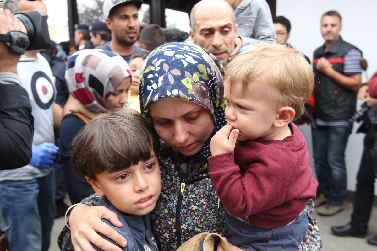 9月5日、ハンガリーからオーストリア国境の町、ニッケルスドルフに到着した難民の親子(Getty Images)