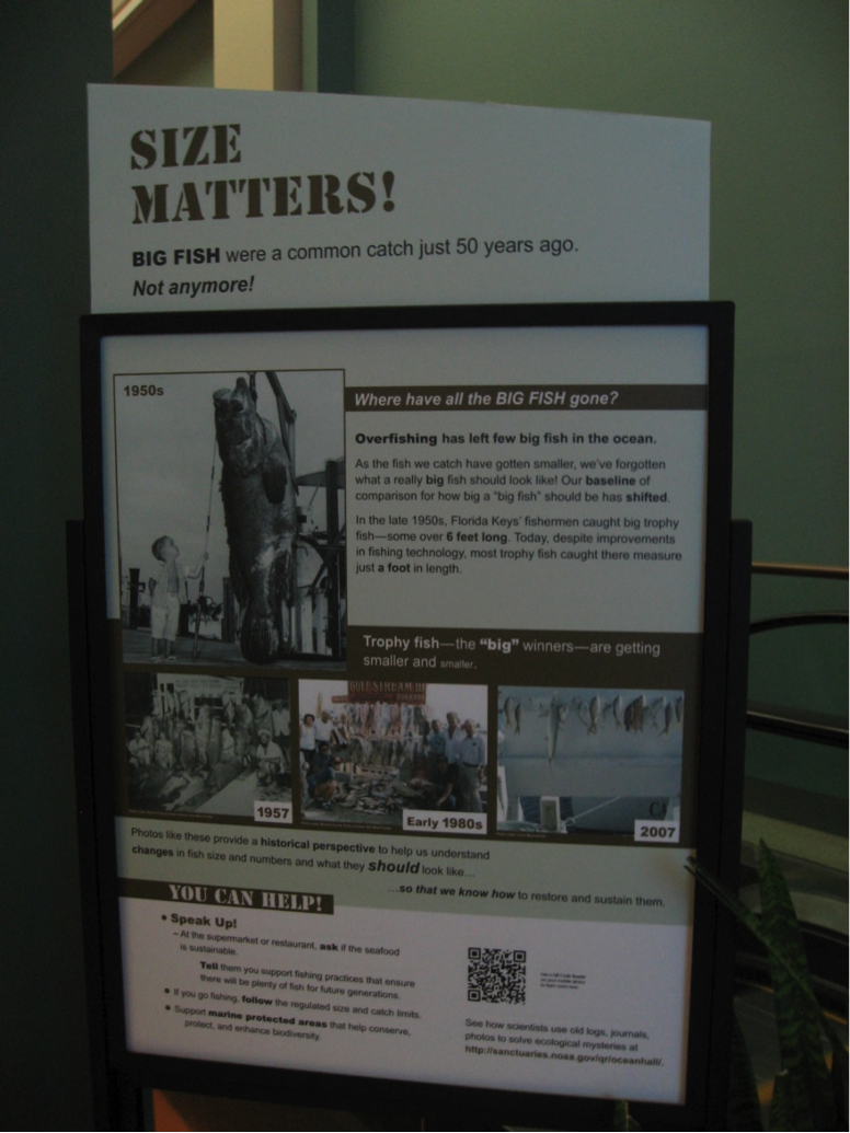 ス ミソニアン博物館の「シフティング・ベースライン」のパネル説明。「私たちが捕まえる魚が小さくなると、もともとこの魚がいかに大きかったかということを 我々は忘れてしまう。『大きな魚』というものがどのくらい大きいかということに関する我々の比較のベースラインはシフトしてしまうのだ」との解説が付され ている。筆者撮影