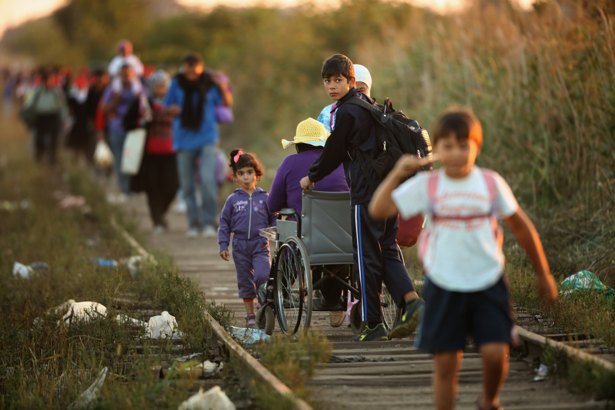 セルビアからハンガリーに向けて線路を歩く難民たち(Getty Images)
