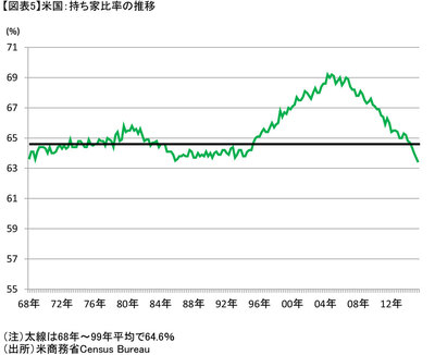 また、アメリカ経済の構造調整では、サブプライムローンや消費者ローンの借り入れで膨れ上がった家計債務はほぼ従来のトレンド上に戻り、過剰債務が大方解消している(図表4)。同時に、良し悪しは別にして、サブプライムローンで本来自宅所有が難しい所得層にまで広がった持ち家は統計開始以来最低の水準にまで低下している(図表5)。