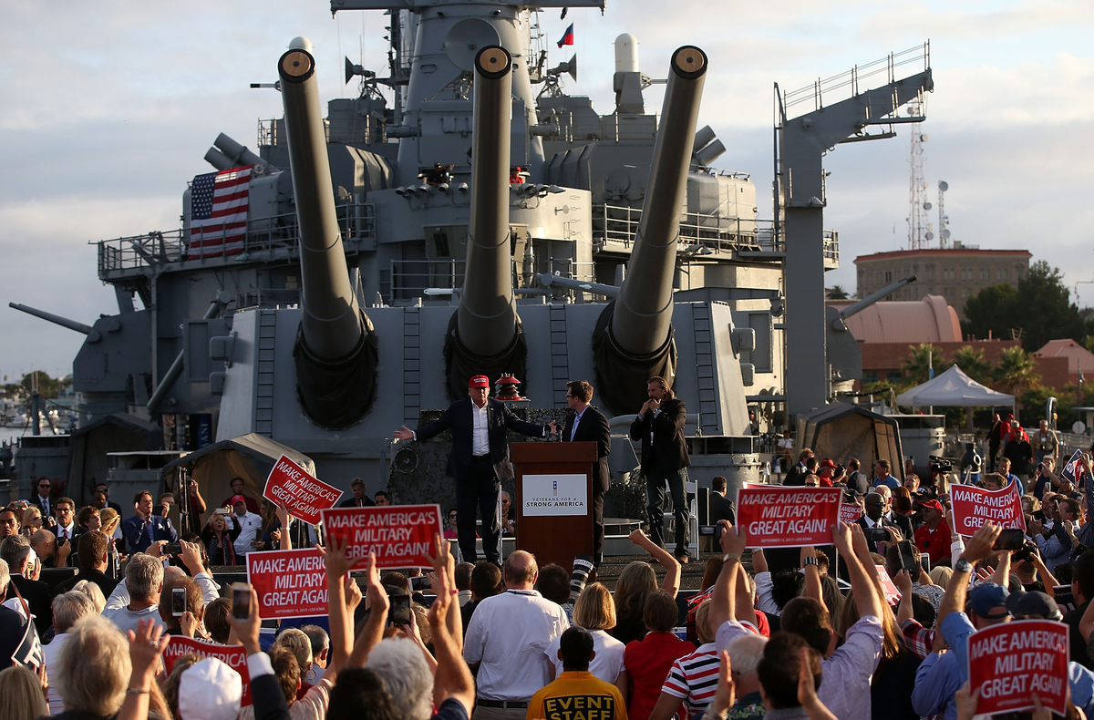 9月15日、ロサンゼルスのサンペドロ港に永久停泊された戦艦アイオワで演説するトランプ氏(Getty Images)