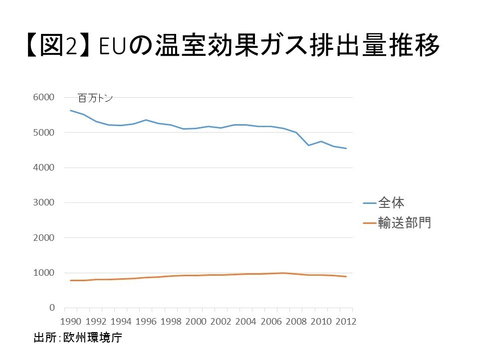 EUでは、東欧諸国の市場経済への移行が始まった1990年からエネルギー効率の改善が進み、温室効果ガスが削減された。東欧諸国の効率の悪い設備の更新が行われたためだ。90年の温室効果ガス排出量56億3000万トンは、12年には45億4000万トンまで19%減少するが、輸送部門からの排出量は07年にピークを打ったものの、12年には90年比14%増加している。図-2の通りだ。