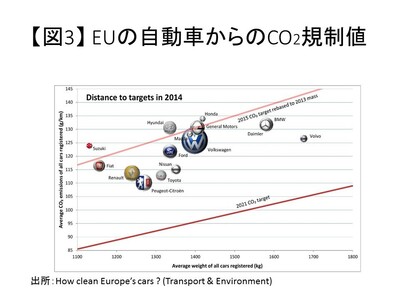 2009年に、15年に発売される新乗用車からのCO2排出量の規制値がEUで初めて決定された。規制値は車の重量により異なるものの平均130g/キロとされ、各自動車メーカーは規制値をクリアするために燃費を向上させることになった。