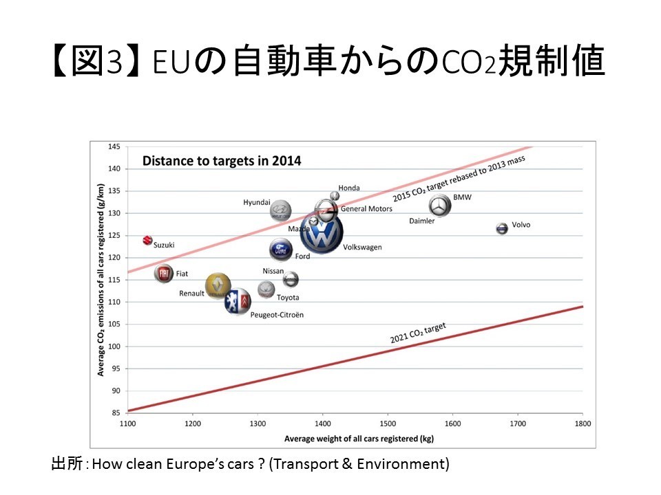 欧州で乗用車を販売している各社の販売車種の重量を基に、14年段階で15年基準及び21年基準をどの程度達成しているか、欧州委員会に近いNGO「輸送と環境」(Transport & Environment)が発表している。その結果は、図-3の通りだ。